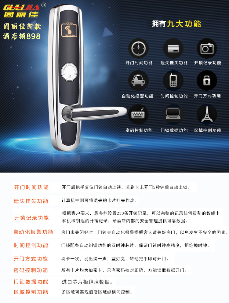 廣州錦盛商務酒店此次與我們固麗科技合作安裝了固麗佳GLJ-898FS的新款智能電子酒店門鎖,此款酒店鎖對每個細節(jié)精益求精,在莊嚴氣派中追求奢華優(yōu)雅,而融入現(xiàn)代設計手法后,則更貼近于實用性。其豪華的氣質更是奢華與尊貴的象征,是各大星級酒店賓館首選。固麗佳酒店鎖可靠的質量與完善的售后服務是各大酒店安裝智能門鎖的首要選擇。